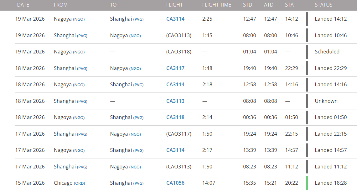 なんとシカゴから上海に飛んだあとは、上海~セントレアを四往復もしてるじゃん